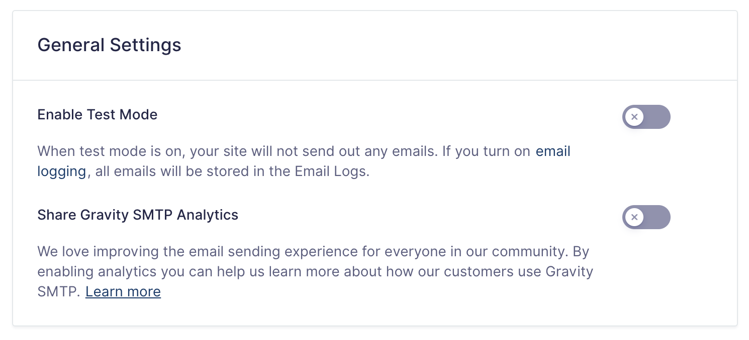 The default tab in the Gravity SMTP Settings area allows you to enter and activate your license key and enable or disable both Test Mode and Usage Analytics. Test Mode allows you to perform testing on your website without actually passing any messages to your chosen SMTP integration for delivery. Usage Analytics shares info such as connected integration so that our product team can focus product improvements.