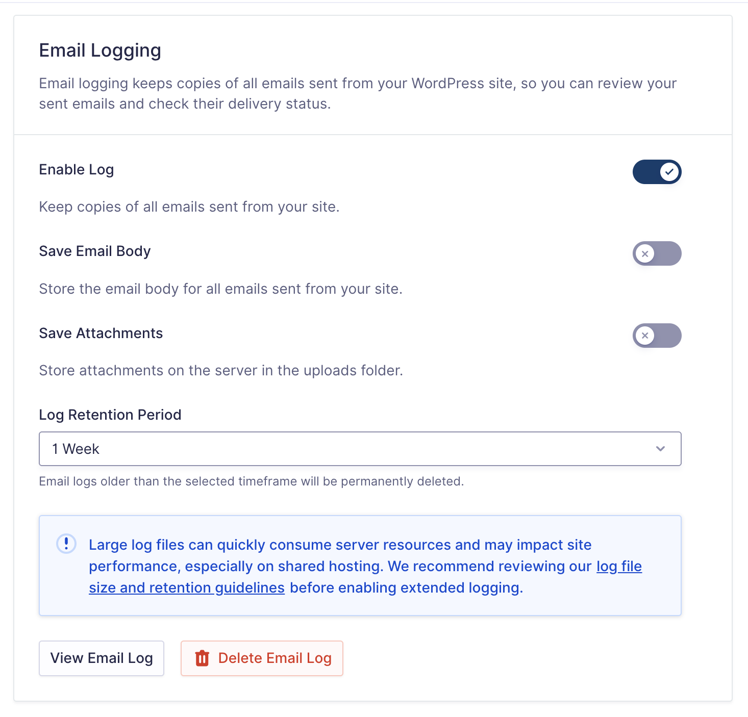 | Log Retention Period | Set the time period to keep the logs for Gravity SMTP. Email logs older than the selected timeframe will be permanently deleted. |